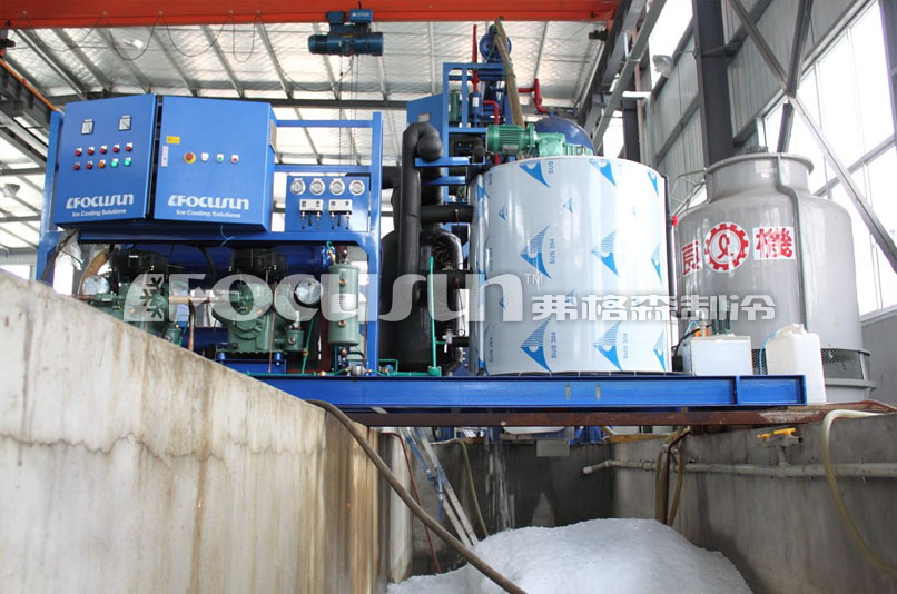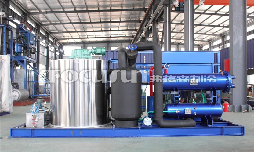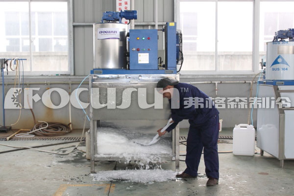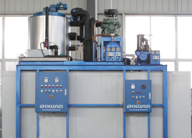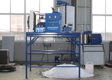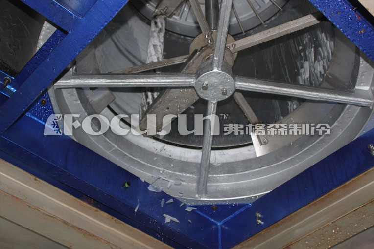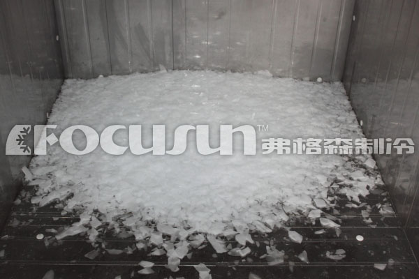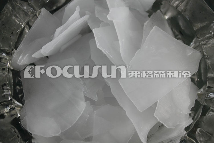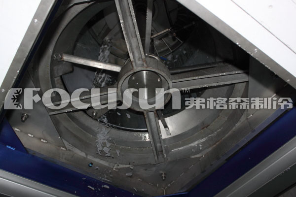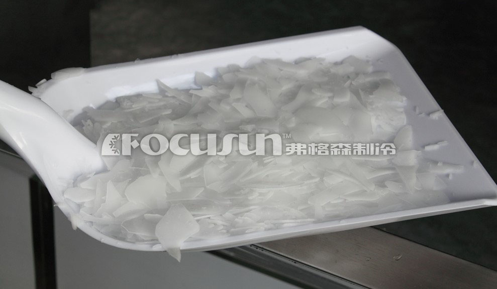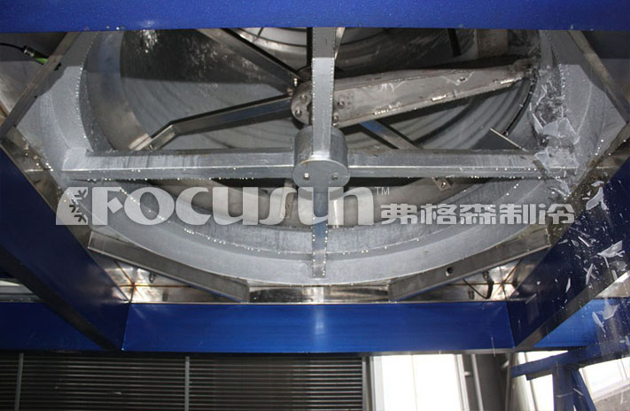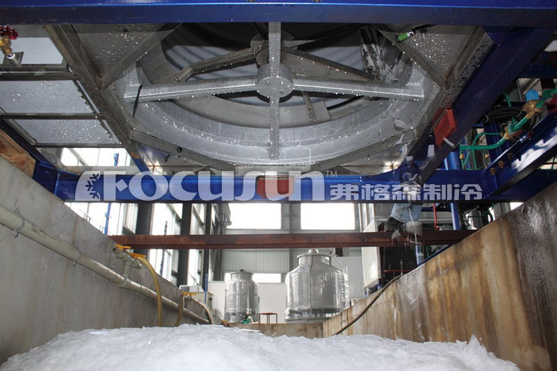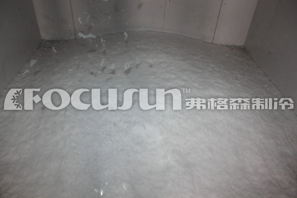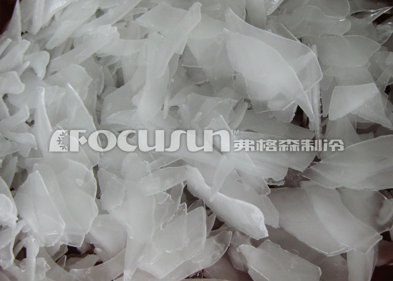عملية صنع الجليد: .. يرش الماء على سطح تجميد بالتساوي من خلال رش المياه ويشكل الفيلم المياه نظرا لتبادل الحرارة مع المبردات، ودرجة الحرارة تنخفض بسرعة حتى يتم تشكيل طبقة رقيقة من الجليد تحت قذف الجليد تزلج، وطبقة الجليد الرقيقة يتحول إلى رقائق الثلج ثم يقع في الجليد بن التخزين من مأخذ الجليد، والثلج فليك التدابير حوالي 40 × 40مم وسمك حوالي 1.5-2.5مم.